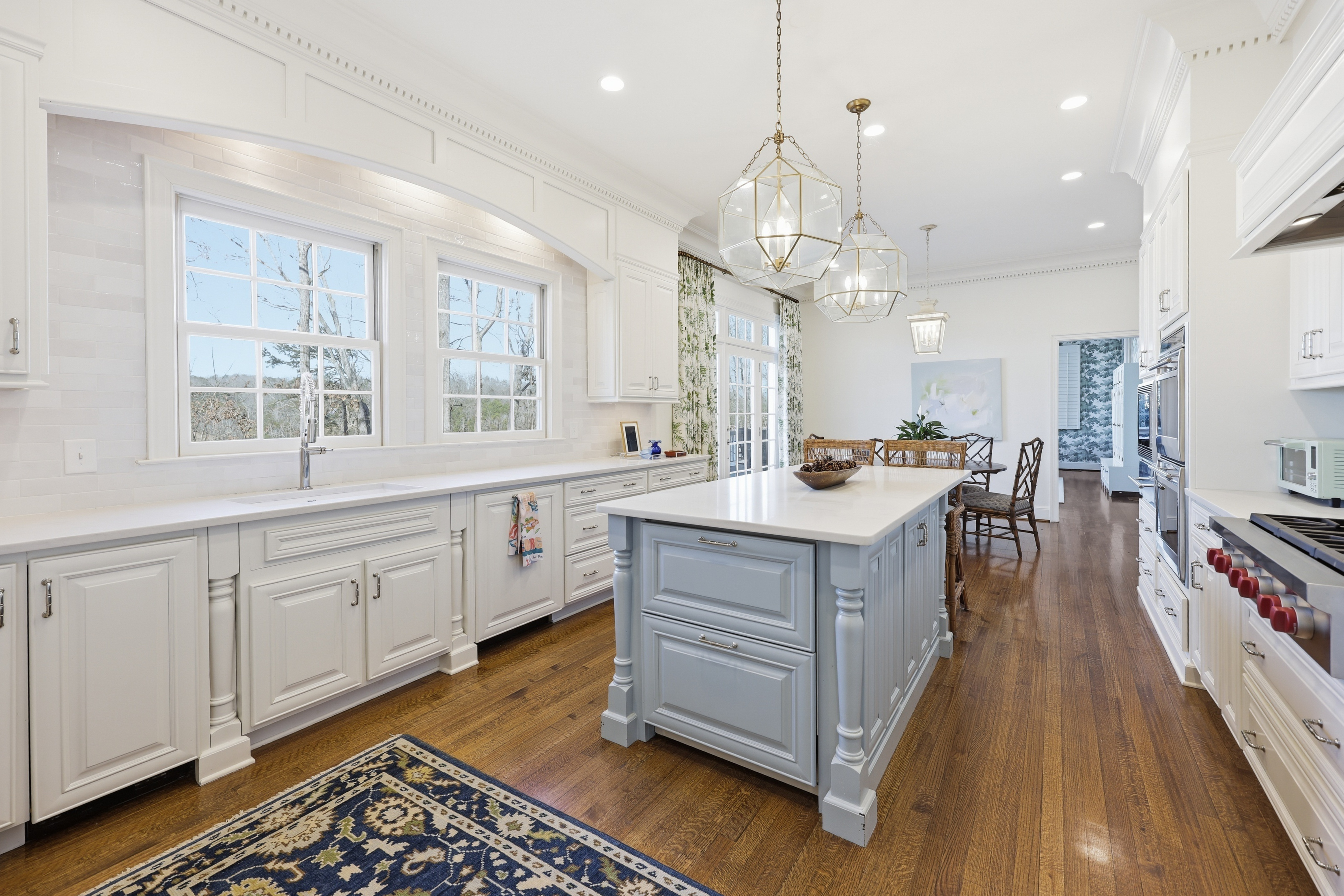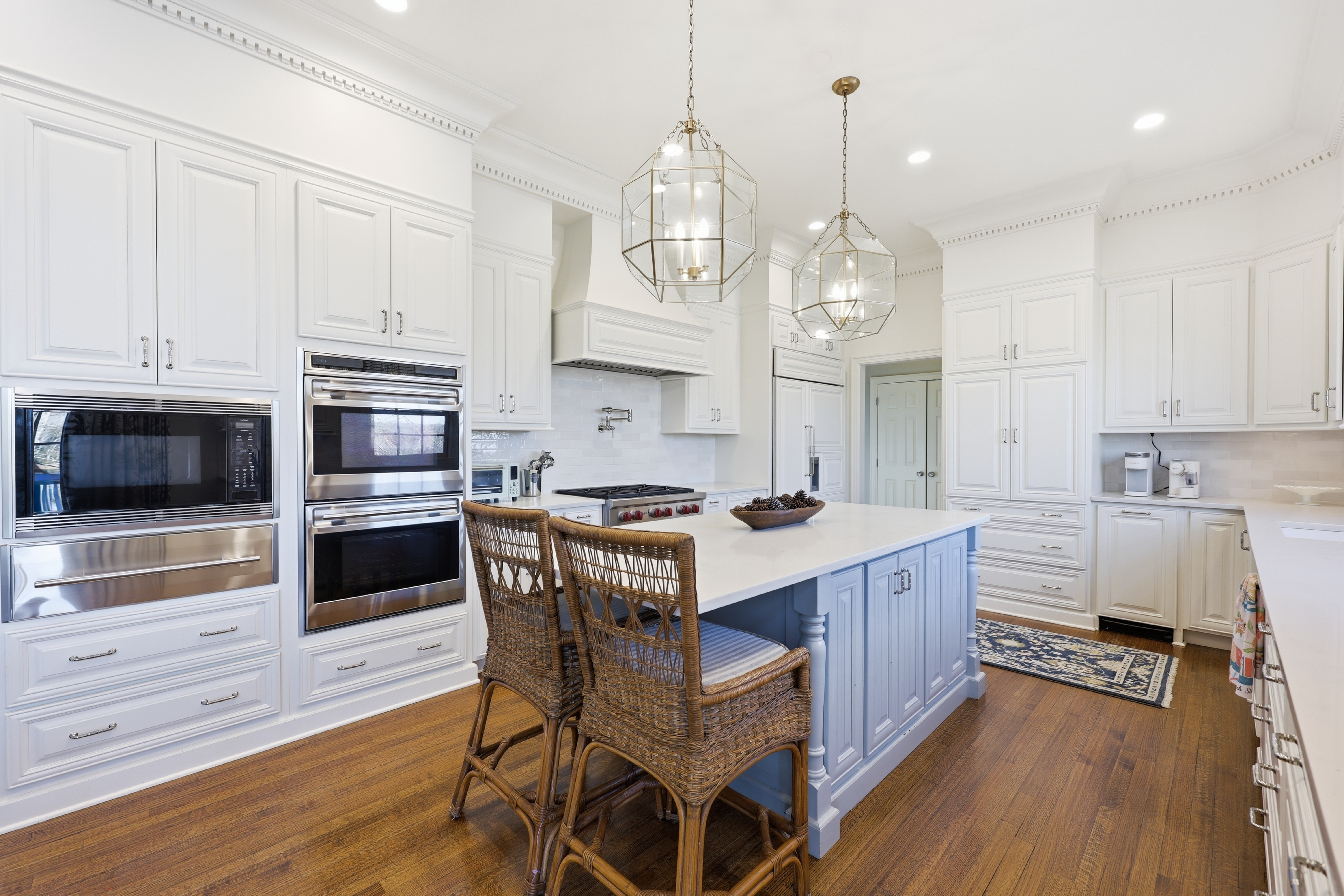 • Top-of-the-line island kitchen featuring Wolf gas range, double ovens, microwave, and SubZero refrigeration.